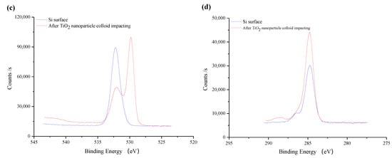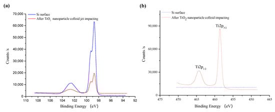 X-ray photoelectron spectroscopy (XPS) was also used to analyze the silicon surface before and after TiO2 nanoparticle colloid jet impacting. Figure 13a,b shows the full spectrum of XPS of the original silicon surface and the silicon surface after TiO2 nanoparticle colloid jet impacting under ultraviolet irradiation, respectively.