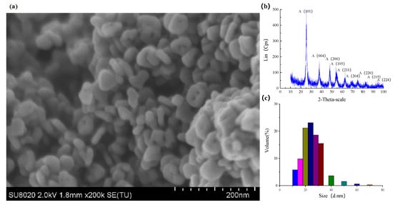 TiO2 nanoparticles used in the experiments. (a) SEM, (b) XRD pattern and (c) Diameter distribution.
