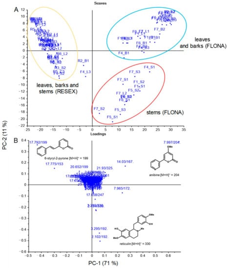 Results of a principal component analysis (PCA) from ESIHRMS data, illustrating the relationship between samples of A. rosiodora from FLONA and RESEX reserves. (A) The score plot and (B) the PCA derived loading plot, presenting the contribution of RT/(m/z) data with cumulative 82% variance within the two components (PC1 and PC2). Samples are coded by “locality_tissue type”, with R = RESEX, F = FLONA, B = bark, S = stems, and L = leaves.
