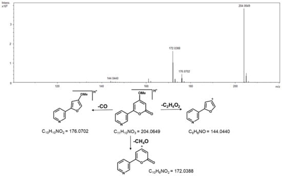 High resolution mass spectrum of anibine [M + H]+ = 204.0649 and its fragmentation pathways.