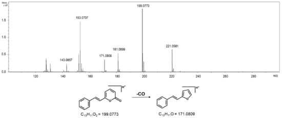 High resolution mass spectrum of 6-styryl-2-pyrone [M + H]+ = 199.0773 and its fragmentation pathways.