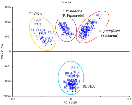 Since samples of A. rosiodora from these two locations presented considerable differences in their volatile organic compounds and methanolic extract composition, samples of A. parviflora from Santarém (Pará) and A. rosiodora from Presidente Figueiredo (Amazonas) were also analyzed for comparison with the Aniba samples from FLONA and RESEX using 1H-NMR data. The NMR spectra of FLONA, RESEX, and other samples are in the Supplementary Data (Figure S2). Analysis of the data was focused on the region between 3.0 and 9.5 ppm to eliminate signals from highly lipophilic compounds (fatty acids). The A. rosiodora samples from RESEX were clustered apart from samples of A. parviflora, A. rosiodora from Presidente Figueiredo, and FLONA, which were all arranged in a distinct cluster (Figure 5). An analysis of the 1H-NMR data from crude methanolic extracts reveals complex spectra profiles and the inspection of the loading plot indicates groups of signals differentiating each sample, but the annotation of the compounds was not achievable (Figures S2 and S3).