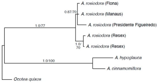 Five accessions of A. rosiodora, including two from RESEX, one from FLONA, one from Presidente Figueiredo, and one from Manaus, as well as A. hypoglauca Sandwith and A. cinnamomiflora C.K. Allen were included in the phylogenetic analysis. Ocotea quixos (Lam.) Kosterm. was included as an outgroup. Voucher information and GenBank accession numbers are listed in Table 2.