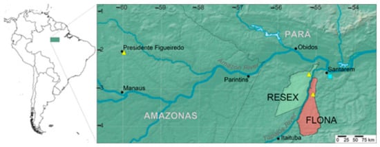 The specimens were collected in the Brazilian Amazon region from two Conservation Units in the State of Pará: Floresta Nacional do Tapajós—FLONA (S 03°03′13.2″/W 054°58′52.3″) and Reserva Extrativista Tapajós-Arapiuns—RESEX (S 02°30′6.1″/W 055°06′30.6″) (Figure 8). All collections were made under permit 23293-3 from the Sistema de Autorização e Informação em Biodiversidade—SISBIO. Five trees were selected in FLONA with DBH (diameter at breast height) between 27 and 45 cm, and in RESEX, 81 trees were found, but among them, 10 specimens were selected with DBH between 20 and 35 cm. Five hundred grams of each sample were collected in April 2011. The temperature and humidity were 25 °C and 92% in FLONA and 24 °C and 92% in RESEX, respectively, as measured by a portable thermos hygrometer (model ITHT 2220, Instrutemp, São Paulo, SP, Brazil).