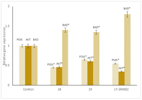 Relative gene expression of PI3K, AKT, and BAD in HCT116 cells after treatment with Compounds 18 and 19 and the positive control LY-294002. Bars represent mean values ± SEM (lines) of three replicates. Asterisks represent significant change relative to the negative control (* p < 0.05).