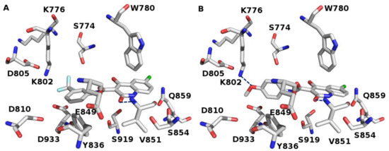 The IFD approach explores the structural changes in proteins in this way: ligands are docked to a protein’s binding domain by Glide docking [36,37,38] and the top ligand conformation is minimized together with PI3Kα binding cleft by the Prime algorithm [38]. Next, a redocking protocol is performed against the minimized PI3Kα. Accordingly, protein flexibility is investigated during the docking procedure. The synthesized core structures make H-bond with S774, A775, K776, W780, E798, K802, D810, Y836, V851, N853, S854, N920, and D933 (Table 3) (Figure 5). Additionally, other computational [19,21,22,23,24,25,28,29,40] and experimental studies [9] highlighted the importance of these amino acids in PI3Kα/ligand complex formation.
