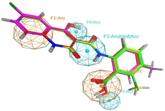 PI3Kα inhibitors pharmacophore model with 14 (red color), 15 (green color), 22 (pink color), and 23 (yellow color).