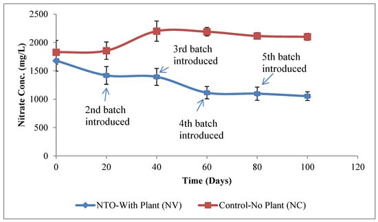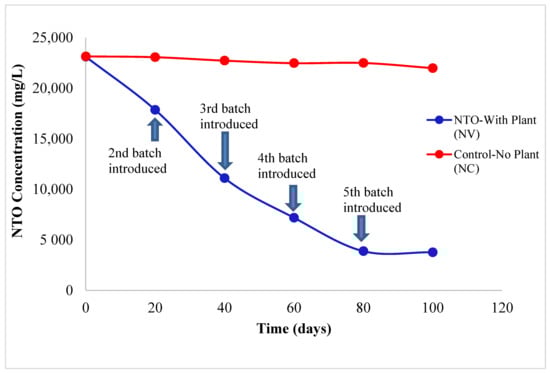 Figure 2 presents the change in nitrate concentration in NTO-wastewater over time for NV and NC treatments. For NV treatments, 37.26 ± 4.52% (±SD) reduction in nitrate in the NTO-wastewater in comparison to its initial value was observed during this study. Nitrogen is an essential nutrient for plant growth, and the reduction in nitrate in NV treatments is due to its uptake by vetiver plants. In contrast, for the NC treatments, nitrate concentration increased by 14.88 ± 3.34% (±SD) on average from its initial concentration during the study. Nitrate efflux from plants is common and occurs in both stressed and non-stressed plants. Efflux increased in plants that are subjected to mechanical or transplantation stress or changes in the pH of the media [].