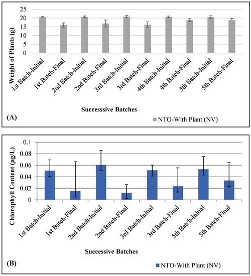 At the end of every successive batch, phytotoxicity analysis was performed on the plant samples (collected from NTO treatment, NV) by conducting a total chlorophyll study and a plant biomass study. Total chlorophyll (as a combination of chlorophyll a and b) extraction from the vetiver samples was performed following standard protocols [,], and the absorbance was measured at 645 and 663 nm using a Cytation 3 microplate reader, Biotek Instruments, Winooski, VT, USA. The weight of each plant was recorded before and after each successive batch study. Before weighing the plants, the roots were dried thoroughly with paper towels.