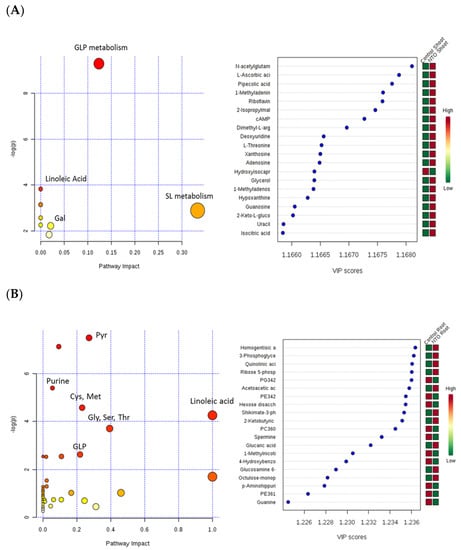 Metabolic profile of vetiver (A) shoot and (B) root grown in NTO-wastewater treatments (NV) compared to control plants grown in a nutrient medium. GLP metabolism—glycerophospholipid metabolism, Gal—galactose metabolism; Linoleic Acid—linoleic acid metabolism; SL metabolism—sphingolipid metabolism.