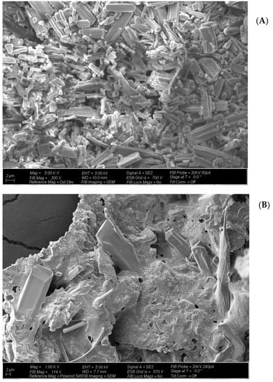 Scanning electron microscope (SEM) image of (A) pure NTO solid (5000×) and (B) plant exudates (1000×). Distinctive block-like structures were visible when pure NTO particles were examined. The presence of block-like structures was seen in plant exudates, which showed that NTO is a part of the exudates.