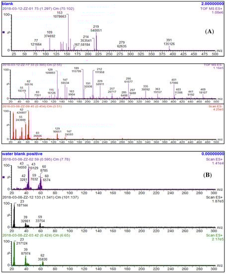 Electrospray ionization mass spectrometry (ESI-MS) analysis of NTO-wastewater and plant exudates at (A) negative mode and (B) positive mode. Both figures contain a blank (top), NTO-wastewater (middle), and plant exudates (bottom). NTO peak was recorded at an m/z ratio of 129 Da in both NTO-wastewater and plant exudates under negative mode.