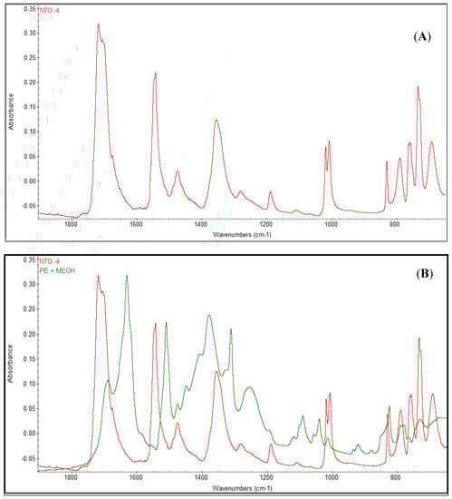 FTIR spectra of (A) pure NTO solid, and (B) both solid NTO and plant exudates. Peaks at 1800–1600 cm−1 (for C=O bonds), 1550–1500 cm−1, and 1372–1290 cm−1 (for N-O bonds) are distinct for NTO. All three distinct peaks were also visible for plant exudates.