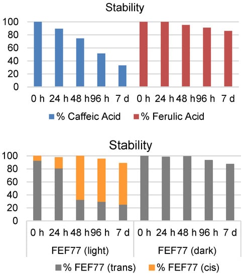 Although trans–cis photoisomerization of cinnamic acids has been previously documented in the literature [15,16], the process is usually promoted by UV light, which is unlikely to be present inside a laboratory environment. Moreover, FA and CA did not show this behavior when treated in the same conditions. These data led us to deeper investigate the photoisomerization of FEF77.