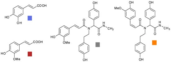 NMR spectra were taken at r.t. in CD3OD at 300 MHz (1H), and 75 MHz (13C), using as an internal standard, the central peak of CD3OD (1H-NMR in CD3OD; 3.310 ppm) or the central peak of CD3OD (13C in CD3OD; 49.00 ppm). Chemical shifts are reported in ppm (δ scale). Peak assignments were made with the aid of gCOSY and gHSQC experiments. In the ABX system, the proton A is considered upfield and B downfield. IR spectra were recorded as solid, oil, or foamy samples, with the ATR (attenuated total reflectance) technique. TLC analyses were carried out on silica gel plates and viewed at UV (λ = 254 nm or 360 nm) and developed with Hanessian stain (dipping into a solution of (NH4)4MoO4·4H2O (21 g) and Ce(SO4)2·4H2O (1 g) in H2SO4 (31 mL) and H2O (469 mL) and warming). Rf values were measured after an elution of 7–9 cm. Column chromatography was done with the “flash” methodology by using 220–400 mesh silica. Petroleum ether (40–60 °C) is abbreviated PE. All reactions employing dry solvents were carried out under nitrogen. Extractions were always repeated three times and organic extracts were always dried over Na2SO4 and filtered before evaporation to dryness. Caffeic acid, ferulic acid, and DPPH radical were purchased from Sigma Aldrich Chemical; methanol and acetonitrile (HPLC grade) were hypergrade for LC-MS from Merk or Carlo Erba Reagents.