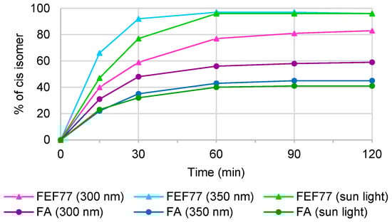 First, 70 mM solutions of FA and t-FEF77 in CD3OD were exposed to different light sources (300, 350 nm, and direct sunlight) and 1H-NMR spectra were registered over time until the steady-state was reached (15, 30, 60, 90, and 120 min). The trans/cis ratio was determined by integration.
