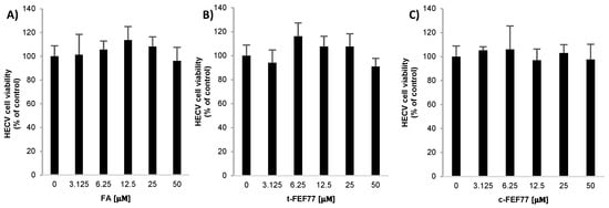 Viability of human endothelial cord vein (HECV) cells treated with: (A) FA, (B) t-FEF77, or (C) c-FEF77 at 3.125, 6.25, 12.5, 25, and 50 µM for 24 h. Data are expressed as percent vs. control (0). Values are mean ± S.D from at least three independent experiments.