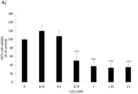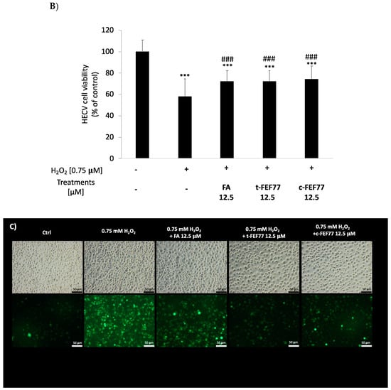 Secondly, we tested HECV cell viability after a 2 h treatment with H2O2 ranging from 0.25 to 1.5 mM. As shown in Figure 4A, at concentrations ≤0.75 mM, H2O2 significantly reduced cell viability by ≥50% (p ≤ 0.001 with respect to control). Therefore, 0.75 mM H2O2 was the concentration selected for further experiments, in which HECV cells were pretreated with 12.5 μM polyphenols (FA, t-FEF77, and c-FEF77) for 24 h and subsequently with H2O2 for 2 h. As shown in Figure 4B, polyphenol pretreatment significantly prevented the decrease in cell viability induced by H2O2 (+25% for both FA and t-FEF77 and +28% for c-FEF77; p ≤ 0.001 for all with respect to H2O2 0.75 mM, Figure 4B).