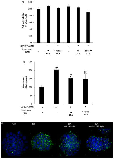 The effects of FA and t-FEF77 on triglyceride (TAG) accumulation in O/P FaO cells were then evaluated. As shown in Figure 5B, cell exposure to O/P for 3 h resulted in significant TAG accumulation (+105%; p ≤ 0.001 with respect to control), as previously demonstrated [24,25]. FA or t-FEF77 per se did not alter lipid content in control cells (data not shown), but the treatment of O/P cell with FA or t-FEF77 12.5 μM for 24 h significantly reduced intracellular TAG content with respect to O/P (−26%; p ≤ 0.01). These results were confirmed by fluorescence microscopy visualization of intracellular lipid droplets stained with BODIPY 493/503. As shown in Figure 5C, only a few green droplets are detectable in control FaO cells, whereas their number increases after O/P treatment. Upon a 24 h incubation with FA or t-FEF77, fewer lipid droplets are detectable as compared to O/P cells.