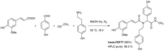 One-step synthesis of feruloyl amide trans-FEF77 employing ferulic acid, 4-hydroybenzaldeyde, tyramine, and methyl isocyanide.