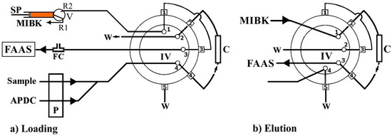 A Perkin-Elmer (Norwalk, CT, USA) Model FIAS-400 flow injection system operated in preconcentration mode was coupled with the 5100 PC FAAS. The FIAS-400 manifold comprised a peristaltic pump for sample or standard solution and chelating reagent propulsion via tygon tubing and a micro-syringe pump (MicroCSP-3000, FIAlab instruments, Bellevue, WA, USA) equipped with a 2.5 mL glass barrel (TECAN) and a three-position Teflon/Kel-F valve on the top of it, for MIBK (eluent) propulsion. The FI system includes a 5-port 2-position injection valve, IV, which integrates the microcolumn, C fixed at ports 2 and 4, as it is shown in Figure 1 (Figure S2). The integrated FAAS/FIAS-400 system was controlled by a personal computer operated with the AA Lab Benchtop version 7.2 software program. The connecting tube between the IV and the nebulizer of FAAS was as short as possible, (polytetrafluoroethylene (PTFE) tube, 20 cm length, 0.5 mm i.d.). A VICI® (Valco Instruments Co. Inc.) (Houston, TX, USA) three-section “T” type confluence connector made of polyether ether ketone (PEEK) with 0.5 mm i.d. bore size, serving as a flow compensation (FC) unit, was adapted between the FAAS nebulizer and the FIAS system. All the tubing of the flow system was made of polytetrafluoroethylene (PTFE).
