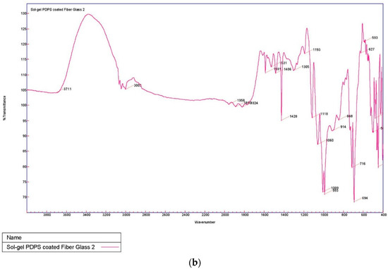 The sol–gel PDPS-coated glass fiber was characterized using Fourier Transform Infrared Spectroscopy (FT-IR). Figure 2 represents the FT-IR spectra of (a) pristine PDPS polymer; and (b) sol–gel PDPS-coated glass fiber.
