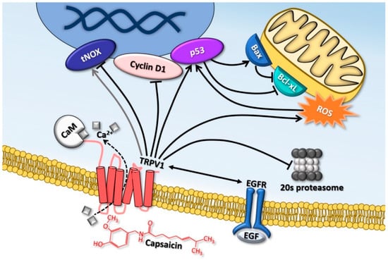 - Hwang, M.K.; Bode, A.M.; Byun, S.; Song, N.R.; Lee, H.J.; Lee, K.W.; Dong, Z. Cocarcinogenic effect of capsaicin involves activation of EGFR signaling but not TRPV1. Cancer Res. 2010, 70, 6859–6869. [Google Scholar] [CrossRef] [PubMed]