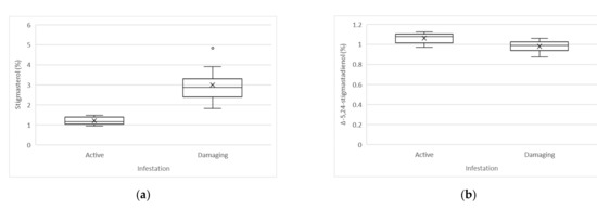 | Parameter | Active Infestation(mg/kg) | Damaging Infestation(mg/kg) | p-Value |