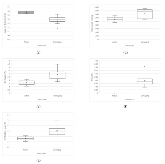 | Parameter | Unit | Active Infestation | Damaging Infestation | p-Value | Limit Value |