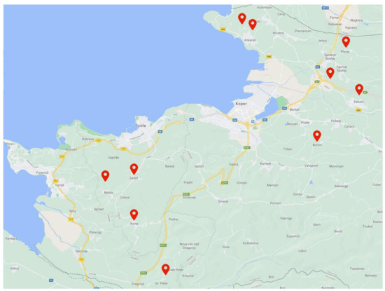 - Bandelj, D.; Baruca Arbeiter, A.; Bešter, E.; Bučar-Miklavčič, M.; Butinar, B.; Čalija, D.; Hladnik, M.; Hladnik, T.; Kanjir, Ž.; Levanič, T.; et al. ABC o ‘Istrski Belici’/Factsheet on the Olive Variety ‘Istrska Belica’/L’ABC della Varietà ‘Bianca Istriana’. Science and Research Centre Koper. 2014. Available online: https://www.zrs-kp.si/wp-content/uploads/2020/12/ABC-o-istrski-belici-2014-pomanjsano.pdf (accessed on 16 December 2020).