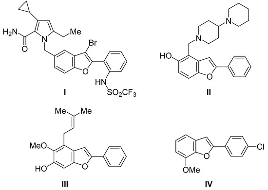 Benzo[b]furans are important heterocycles because they are key skeletons in many natural products, bioactive compounds, and organic materials [1,2,3,4,5,6]. 2-Arylbenzofuran derivatives in particular have attracted significant interest because of their potential as biological and pharmaceutical therapeutic agents [7]. For example, saprisartan (I) [8,9] acts as an angiotensin II receptor antagonist and renin-angiotensin system inhibitor, compound II displays potent hepatoprotective and antioxidant activities [10], compound III shows antitumor activity on a panel of human cancer cell lines [11], and compound IV has promotive activity on estrogen biosynthesis [12] (Figure 1).