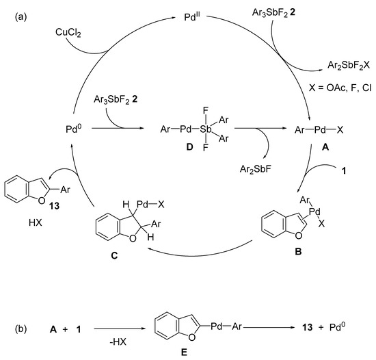 At present, the reaction mechanism is unclear. We consider that the mechanism would be similar to that of the C–H arylation of benzofuran with MIDA boronates and benzenesulfonyl chlorides proposed by Wu and Doucet et al., respectively, for the synthesis of 2-arylbenzofurans [22,24]. Additionally, Gushchin et al. reported the Heck-type C- arylation of methyl acrylate and alkenes with pentavalent organoantimony compounds such as Ar3Sb(OAc)2 and Ph4SbOAc [31,32]. Possible mechanisms for the C–H arylation of Ar3SbF2 with benzofurans are depicted in Figure 2. The initial step is the transmetalation of Pd(II) with Ar3SbF2 2 to afford Ar-Pd-X A with liberation of Ar2SbF2X [31]. Coordination of benzofuran to complex A leads to the generation of complex B, which undergoes arylpalladation of the benzofuran to give intermediate C (Figure 2a). β-Hydride elimination and reductive elimination form coupling product 13 and HX, and generate a Pd(0) species. The Pd(0) species is oxidized by the copper regent, and Pd(II) is regenerated. An alternative pathway would involve the oxidative addition of Ar3SbF2 to the Pd(0) species to give ArPdSb complex D, which is then transformed to complex A and Ar2SbF [31]. By-products such as Ar2SbF and Ar2SbF2X that would be released in this reaction have not been confirmed or isolated at this point. An alternative pathway is also under consideration (Figure 2b); electrophilic aromatic substitution and/or concerted metalation-deprotonation proceeding from intermediate B and benzofuran to form complex E are also conceivable. Intermediate E undergoes reductive elimination to afford coupling product 13.