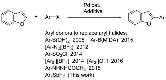 2.1. Pd-Catalyzed C–H Arylation of Benzofurans with Triarylantimony Difluorides