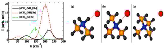Far-IR spectra (left) and ion pairs geometries (right) of three alkylammonium salts: (a) [(CH3)2NH2]Br, (b) [(CH3)3NH]Br, and (c) [(CH3)4N]Br [40]. Reprinted with permission of American Chemical Society.