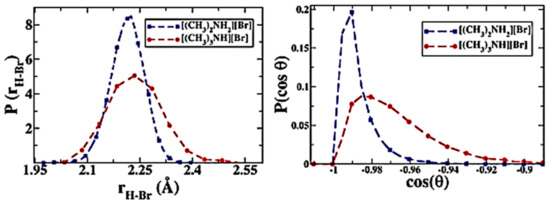 There also exists hydrogen bonding between anion and cation in task specific ILs such as halogenated quaternary ammonium ionic liquids (i.e., N-trimethyl-N-propylammonium bis(trifluoromethylsulfonyl)imide ([N3111][NTf2]), bihydroxyethylbiethylammonium bromide ([NEt2(HE)2]Br)), amino acid-based ionic liquids (i.e., L-proline trifluoroacetate ([L-Pro][CF3COO]), L-proline sulfate ([L-Pro]2[SO4])), protic ionic liquids (i.e., [(CH3)3NH][NO3], dimethylammonium bromide ([(CH3)2NH2]Br)), etc. In these ILs, the cation and anion contain proton acceptor and donor sites, resulting in formation of an extended hydrogen bonding network [36,37,38]. The hydrogen bonding between the anion and cation expressed as +[A–H···B]− shows particular features in the geometric, electronic, and dynamic aspects, which is inherently different from that of the conventional hydrogen bonding in molecular solvents expressed as A–H···B [39]. Balasubramanian et al. [40] used DFT and AIMD simulations to study the vibrational signals of cation-anion hydrogen bonding in protic ILs. In FTIR spectra, the vibration signals of hydrogen bonding were detected in the range of 150–240 cm−1, as shown in Figure 2 (left). With the increase of the number of hydrogen bonding on the cation, blue shift in the FTIR was observed and the exact peak position can be adjusted by the strength of the cation-anion hydrogen bonding. The AIMD trajectories were utilized to calculate the bond length and angle in [(CH3)4N]Br, trimethylammonium bromide ([(CH3)3NH]Br) and [(CH3)2NH2]Br, and results are presented in Figure 2 (right). The cation-anion hydrogen bonding in [(CH3)2NH2]Br with the N−H···Br angle of 180° is more linear than that (165°) in [(CH3)3NH]Br (as shown in Figure 3), suggesting stronger intermolecular interactions in the former IL. The calculated NMR results were also in accordance with the vibrational analysis. Ossowicz et al. [41] found that when the imidazolium cation had a chiral center or the anion is halide, the hydrogen bonding could expand in space to form a 3D hydrogen bonding network, which could stabilize the conformation of a single ion to affect the properties of ILs [42].