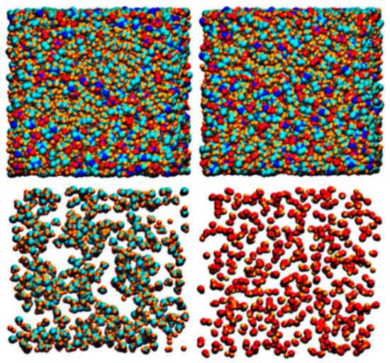 Random snapshots of C8 (left column) and COH (right column). First row: all atoms; second row: terminal groups (CH3 for C8 and OH for COH) only. Carbon atoms are colored with cyan, nitrogen with blue, oxygen with red, and hydrogen with gold [47]. Reprinted with permission of Elsevier.