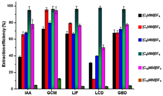 In addition, the changes of alkyl chain length on the cations have an important effect on extraction. Ji et al. [59] investigated the extraction of prenylated flavonoids: glabridin (GBD), licoricidin (LCD), licoisoflavanone (LIF), glycycoumarin (GCM) and isoangustone A (IAA) using six 1-alkyl-3-methylimidazolium ionic liquids, namely [C12mim][BF4], [C10mim][BF4], [C8mim][BF4], [C6mim][BF4], [C4mim][BF4] and [C2mim][BF4]. The results in Figure 5 illustrated that the extraction efficiency of GBD, LCD, LIF, GCM and IAA increased with the increasing of side alkyl chain length from ethyl to octyl, which could be probably attributed to the enhanced hydrophobic interactions with increase of the alkyl chain length as the prenylated flavonoids are hydrophobic. Owing to the obvious increase in viscosity of ionic liquids, the extraction efficiency decreased with the cations further changing from octyl to dodecyl. Therefore, [C8mim]+ was proven to be the optimum cation to extract prenylated flavonoids.