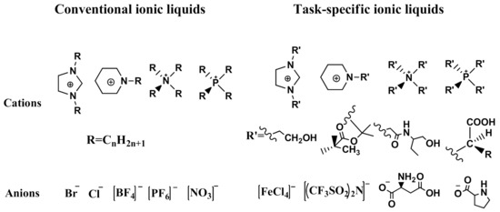 One of the features of ILs is that their properties can be designed by changing the cation and/or anion structure to meet a specific requirement [64]. A series of functional ILs for natural product extraction have been designed, which could be divided into task-specific ILs (TSILs) and IL-derivatives, with the latter referring to porous ILs and molecularly imprinted ILs in this paper. With regard to natural product extraction, the extraction procedure performed with TSILs involved liquid-liquid extraction (i.e., LLE, ABS, or LPME), whereas when IL-derivatives are employed, micro-solid-phase extraction is used. Figure 7 demonstrates typical structures of conventional ILs and TSILs. In the following subsections, natural product extraction using these functional ILs will be introduced in detail.
