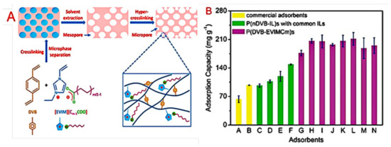 Synthetic route for mesoporous PILs and hypercrosslinked mesoporous PILs (A) and their adsorption capacity for mixed tocopherols (B) [84]. Reprinted with permission from Royal Society of Chemistry.