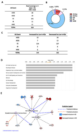 Alternative splicing (AS) events associated with deletion of HuD. (A) Total number of significantly different AS events in HuD KO cortices (n = 3). (B) Proportion of AS differences between KO and controls. (C) Number of increased and decreased inclusion AS levels in HuD KOs. (D) Top biological pathways associated with AS transcripts in HuD KO cortex analyzed by Ingenuity Pathway Analysis (IPA). Yellow line indicates p = 0.05. (E) Top neuronal functions affected by alternative splicing of transcripts. Blue lines predict inhibition of the function, while orange lines predict activation. Blue molecules indicate increased exon inclusion in HuD KOs, while red molecules indicate decreased exon inclusion.