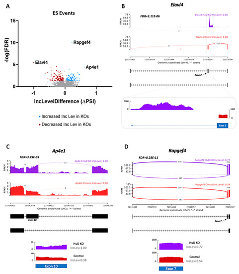 Exon skipping (ES) events associated with HuD KO. (A) Volcano plot showing significant changes (−log(FDR)) vs. inclusion level (Inc level) difference (ΔPSI) between HuD KO and control mice. Blue dots show genes with significantly increased inclusion level differences and red dots show those with significantly decreased inclusion levels in HuD KO cortices. The most significant changes are identified by gene name (n = 3). (B) Top panels show sashimi plots demonstrating exon 2 skipping in the Elavl4 transcript, which is the exon deleted in HuD KOs. The bottom panel shows read coverage using IGV confirming exon 2 skipping in HuD KO. (C) Sashimi plots depicting exon 10 skipping and read coverage for exon 10 in Ap4e1 and (D) sashimi plots and exon 7 coverage in Rapgef4 in HuD KO and control mice.