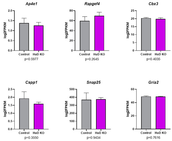 No significant changes in the overall levels of mRNAs that show significant alterations in exon skipping in HuD KO cortex. Panels show the results of RNA-seq levels as log2FPKM along with expression level p-values for six mRNAs that showed significant changes in exon skipping in HuD KO cortices (n = 3).