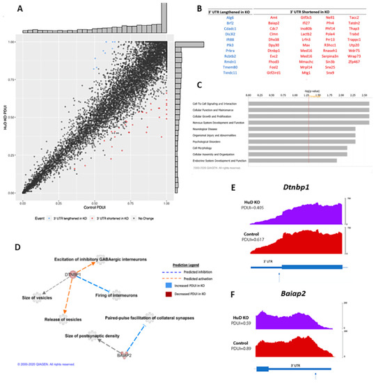 Pathway analyses revealed that mRNAs with alternative polyadenylation changes encoded proteins involved in cell-to-cell signaling and interaction, cellular functions, cellular growth, nervous system development and function and neurological disease (Figure 6C). HuD is known to control synaptic plasticity and neurotransmission, so genes involved in these processes were emphasized. Within the “nervous system development and function” category, two of the most prominent genes in KOs that generated transcripts with shortened 3′-UTRs were Dtnbp1 and Baiap2 (Figure 6D). Dtnbp1 encodes dysbindin, or dystrobrevin-binding protein 1, while Baiap2 encodes brain-specific angiogenesis inhibitor 1-associated protein 2. Using the IPA software, DTNBP1 was found to affect excitation and firing of interneurons (p-value = 0.00297 and p = 0.00887, respectively), along with the probability of release and size of vesicles (p = 0.0322 and p = 0.00887, respectively). BAIAP2 was found to be involved in paired-pulse facilitation of collateral synapses (p = 0.00297) and the size of postsynaptic densities (p = 0.0118).
