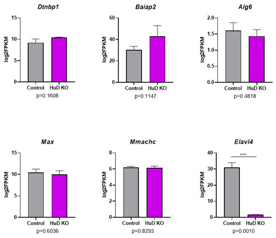 Alg6 encodes the dolichyl pyrophosphate Man9GlcNAc2 alpha-1,3-glucosyltransferase enzyme, Max encodes the Myc-associated factor X transcription factor and Mmachc encodes the methylmalonic aciduria and homocystinuria type C protein. The 3′-UTR of Alg6 was longer in KOs, while the 3′-UTRs of Max and Mmachc were shorter in KOs (Figure 7B–D). Despite the changes in 3′-UTR lengths in these HuD target mRNAs, their expression levels did not differ in KOs vs. control cortices (Table S8). As shown in Figure 8, the overall levels of mRNAs that showed significant alternative polyadenylation did not change in HuD KO cortices. As expected, Elavl4 mRNA levels were significantly decreased in these tissues (Figure 8). These findings indicate that the observed alternative polyadenylation changes were not the result of differential mRNA stability of the long vs. short 3′-UTR isoforms.