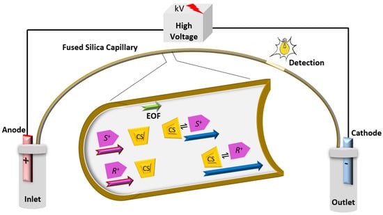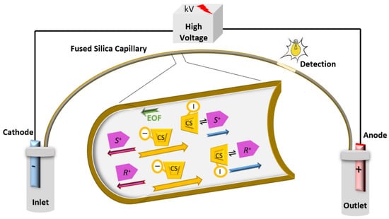 Simple representative schematic diagram of CEKC normal polarity mode of the separation voltage separating a basic ionized enantiomeric racemate (R+ and S+) using CS in the BGE. Pink and green arrows show the apparent mobility (µapp) of the enantiomeric pair and the mobility of the EOF (µEOF), respectively. The blue arrows show the difference in the speed of the migration of enantiomers upon interaction with the CS. µapp of the CS would be according to its charge.