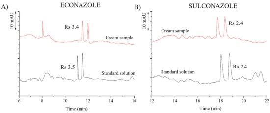 Electropherograms that correspond to the enantiomeric separation of a standard solution (40 mg/mL) and cream samples of econazole and sulconazole. CE conditions: 50 mM phosphate buffer pH 2.5 containing mixtures of (A) 5 mM hydroxypropyl-β-CD with 20 mM tetrabutylammonium-L-lysine at 25 °C; (B) 2 mM hydroxypropyl-β-CD with 25 mM tetrabutylammonium-L-lysine at 15 °C. Other conditions: Uncoated fused silica capillary, 50 μM i.d. × 48.5 cm (40 cm of effective length); UV detection at 200 nm; applied voltage, 30 kV; injection by pressure, 50 mbar for 10 s. Reprinted with permission from [92].