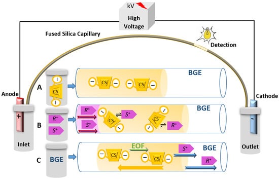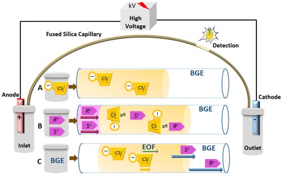 CEKC is a CE mode in which a CS is added directly to the background electrolyte (BGE). The separation of molecules will then result from the dynamic equilibrium with the CS inside the capillary and their different electrophoretic mobilities, if present, in a charged form in the BGE [37,38].