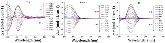 ECD spectra of tryptophan (Trp), N-(tert-Butoxycarbonyl)-valine (Boc-Val), and ibuprofen (IP) with different enantiomeric excess value (ee% value). Enantiomers of each compound have opposite signals. Reprinted with permission from reference [138].