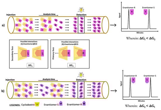Schematic representation of the chiral discrimination process by CDs. In (a), a system is shown in which the CDs migrate in the opposite direction to the EOF, so that the enantiomer involved in the more stable complex ((S)-Enantiomer@CD, correlated with ΔG1), has a longer time of migration. In (b), a system is shown in which the CDs migrate in the same direction as the EOF, so that the enantiomer involved in the more stable complex ((R)-Enantiomer@CD, correlated with ΔG2), presents a shorter migration time.