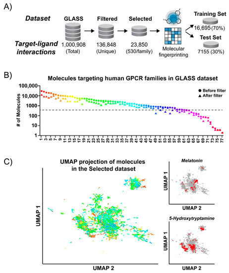Chemical interaction data was downloaded from the GLASS database (https://zhanglab.ccmb.med.umich.edu/GLASS/) in 3 October 2018. All data processing was performed in R version 3.6.3. The raw interaction data was filtered to select compounds that target human GPCRs, have an assigned CHEMBL ID number, and their chemical structure represented in SMILES format [44]. The resulting dataset had a total of 304,564 target-ligand interactions across 230 GPCRs. To facilitate analysis of the data structure and reduce the number of classes required for machine learning each interaction was further assigned into an established GPCR family based on its target receptor [1]. The dataset contained 56,902 unique compounds, with the most frequent molecule occurring 120 times. To reduce biases in target-ligand interaction data and maximize the chemical diversity available for machine learning, data was filtered for unique compound-GPCR family combinations, resulting in a “Filtered” dataset of 136,848 unique molecular interactions with 227 GPCRs. In the resulting dataset, several GPCR families had only a small number of described interactions, therefore, only families having interactions with at least 700 unique compounds were selected for further analysis. This minimum threshold was chosen to balance molecular diversity against total number of training examples for each family.